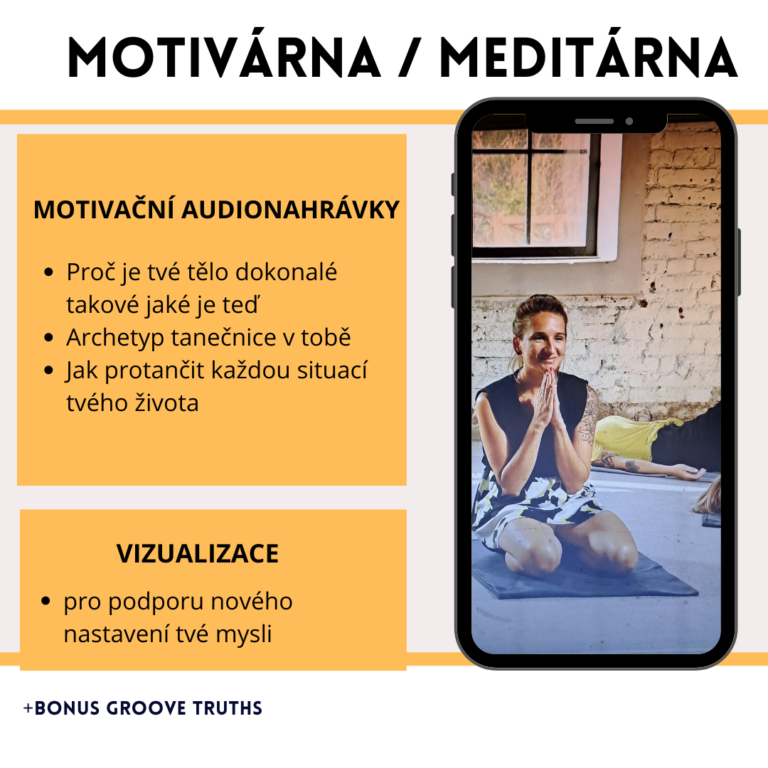 Motivárna/meditárna plná audionahrávek pro poslech a pro okamžiky, kdy se budeš chtít víc nořit do sebe a do celého přesahu groove dance – např.: „Proč je tvé tělo dokonalé jaké je teď“ je krásně léčivé a následná vizualizace k němu ještě umocní toto důležité nastavení tvé mysli.