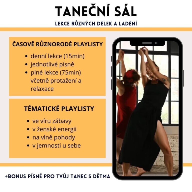 vybírat si můžeš dle tvé chuti z tématických playlistů nebo dle tvého času – playlisty různých délek, ale třeba i jednotlivé písně. Každý den je pro tebe nachystaný „Denní song“ a „Tvá denní patnáctiminutovka“ pro tvé každodenní tančení, kdybys nechtěla trávit čas vybíráním si písní a dáš mi důvěru, vybírám ti krásné mixy. Zároveň i plné lekce pro ty dny, kdy se budeš chtít do tance ponořit na delší čas.
